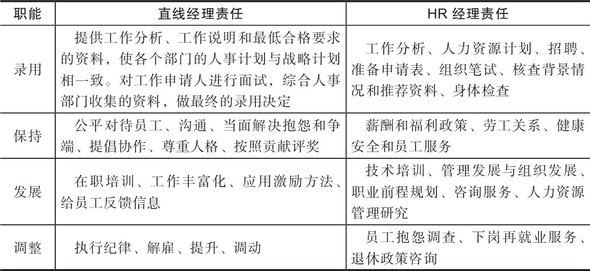 我们可以将上述直线经理和人力资源经理的人力资源管理职责的区别总结于表1-3中。