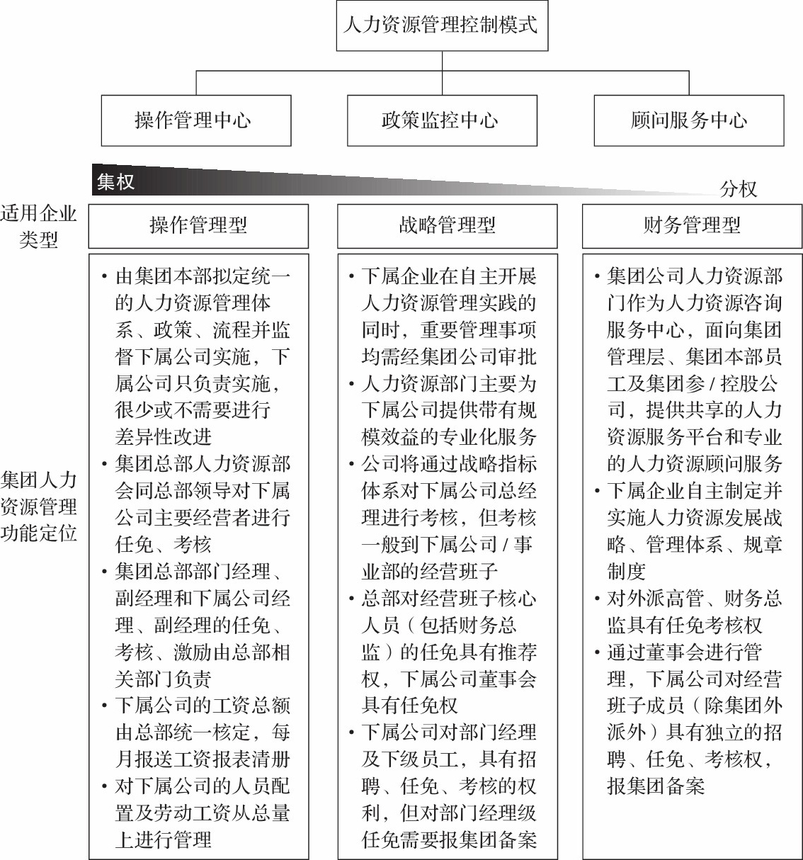 (2)人力资源管控体系设计的基本逻辑框架。人力资源管控是多体公司的人力资源管理区别于单体公司人力资源管理最重要的特征之一。人力资源是多体公司中相对分散(分布在各个单位)和相对多样的资源,如何充分发挥多体公司在人力资源管理方面的整体优势是企业需要思考的管理问题,也是人力资源管理管控的出发点。与多体公司管控模式相对应,多体公司人力资源管理的功能定位也有三种模式,分别适用于不同的管控模式,如图1-3所示。