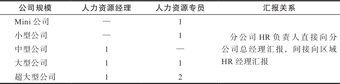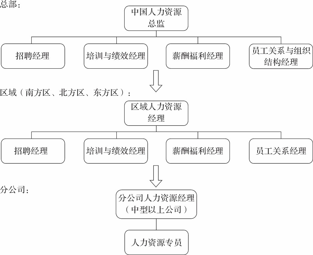 DHL中国公司的组织架构采用总部、区域和分公司三层结构,设立了北方区(北京)、东方区(上海)和南方区(广州)三个区域中心,采用对应的三层人力资源管理结构,如图1-5所示。根据上一年营业收入的规模,中国公司把分公司分为五个类型并实施不同的人力资源人员配置,如表1-4所示。