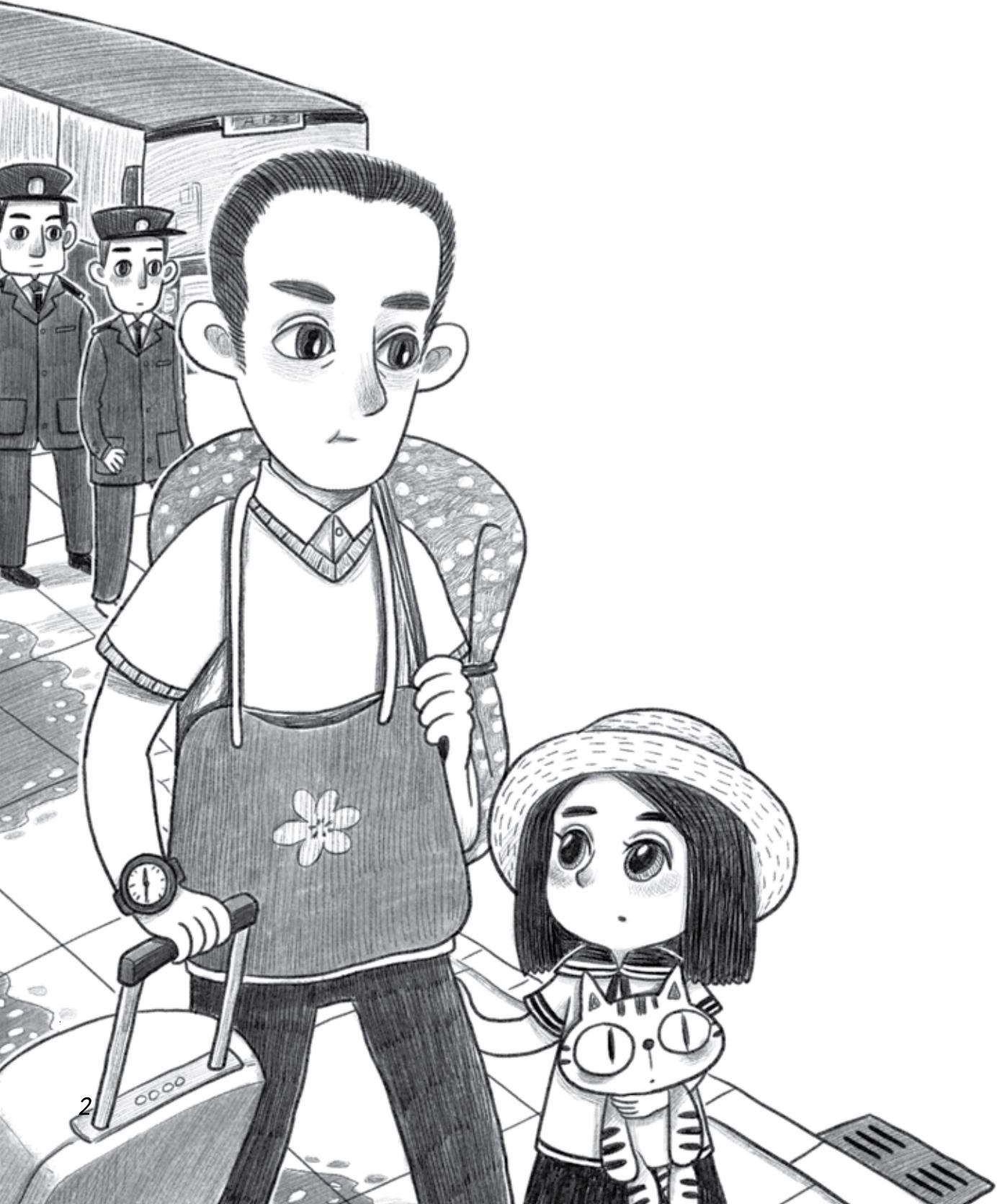 走在最前面的是一对父女,爸爸四十来岁,女孩大约十岁。女孩叫小城。小城爸爸一手拖着一只小皮箱,另一只手抱着一捆棉被,肩膀上还挂一个布包。小城抱着一只花布猫,跟在爸爸身边,她边走边回头看后面的那两个人,他们是警察。