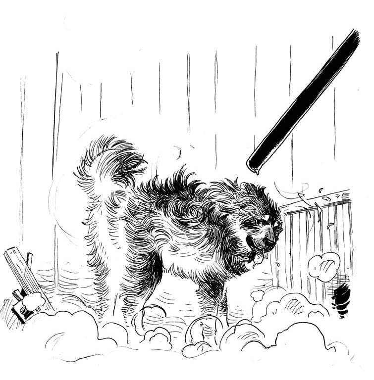 有一击异常猛烈,他勉强爬起来,眼冒金星,已经无法再冲。他蹒跚地走着,鼻子、嘴和耳朵都淌着血,美丽的皮毛上血液和唾液混在一起,星星点点,到处都是。正在这时,那人走上前来,故意对准他的鼻子,狠狠地给了他一棍。和这次撕心裂肺的疼痛比起来,前面那些都不值一提。怒不可遏的布克发出了狮子一样的咆哮,再次向那人猛扑过去。可是那人迅速把大棒从右手换到左手,沉着地抓住他的下颚,一边往后拧一边往下拽。布克的身体在空中画了一个圈,又画了半个圈,然后头部和胸部着地,无助地栽到地上。