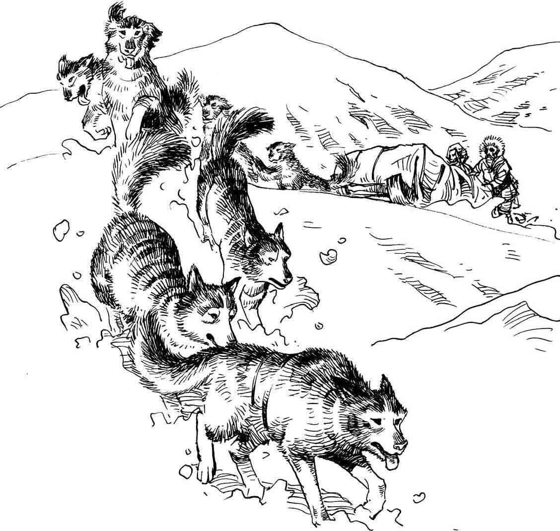 直到早晨被营地忙乱的声音吵醒,布克才睁开眼睛。一开始他不知道自己躺在什么地方。夜里又下了大雪,他完全被雪埋住了。周围都是雪墙,一阵恐惧涌来,几乎将他吞没,因为所有的野兽都害怕陷阱。他的这种反应很有深意,表明他正逐渐走出从前的生活,聆听祖先的呼唤。他是一条在文明社会长大的狗,早已被驯化,以他个人的经验来说,从来不知道什么是陷阱,更谈不上害怕了。他整个身体的肌肉本能地抽搐着,脖子和肩上的毛不自觉地竖起,伴随着一声凶恶的咆哮,他猛地跃出了雪坑。外面白得刺眼,大片大片的雪花在他周围盘旋。脚还没有着地,他就看见白色的营地横卧在前面。布克立刻想起自己身在何处了,从马努埃尔带自己出门到昨晚在雪地挖坑睡觉的事,一幕幕从眼前闪过。