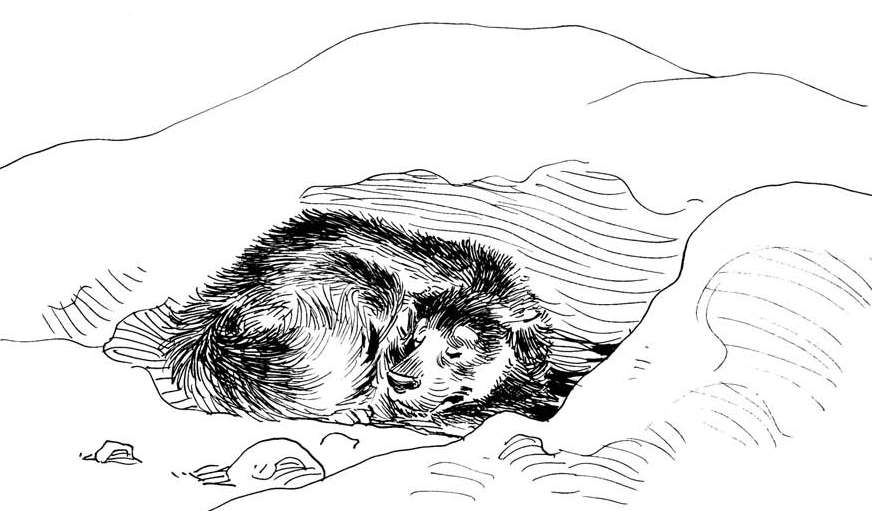 他终于有了主意。他决定回到原地,看看他的同伴是怎么办的。奇怪的是,他们竟然不见了。他在营地周围找了一圈,也不见他们的踪影,于是又回来了。难道他们睡在帐篷里?不,这不可能,不然他自己就不会被赶出来了。那他们会上哪儿呢?他垂着尾巴,浑身发抖,感觉异常凄凉,独自绕着帐篷茫然地走着。突然,他前腿下面的雪往下一沉,他马上陷了下去。脚底下有什么东西在动,他赶快往后一跃,竖起颈毛,大声叫了起来,任何看不见的未知事物都令他害怕。一声友好柔和的吠叫让他心里踏实了许多,他又回去看个究竟。一股温暖的气息喷到了他鼻子里,他看见雪里蜷缩着肉乎乎的一团东西,原来比利躺在那儿。他柔声咕噜着,扭动着身体,向布克表达他的友善,甚至还用温暖湿润的舌头舔布克的脸,希望能打消布克的疑心。