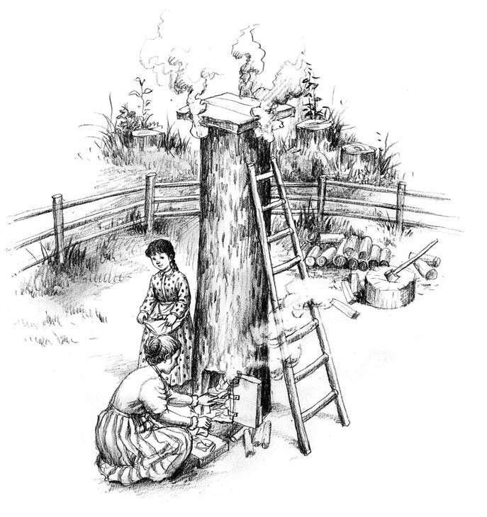 新鲜的山胡桃木燃烧得很慢,没有火苗,空树干里弥漫着呛人的浓烟。爸关上门,一小缕烟从门缝里挤出来,还有一小缕烟从盖子边冒出来,但大部分烟都跟鹿肉一起关在里面了。