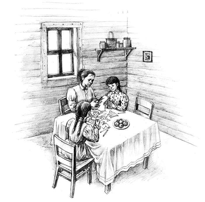 一天的工作结束后,妈有时会给她们剪纸娃娃。她用硬邦邦的白纸剪出娃娃,再用铅笔画出五官。然后,她用边边角角的彩色纸剪出帽子、丝带和花边,让劳拉和玛丽把自己的娃娃打扮得漂漂亮亮的。