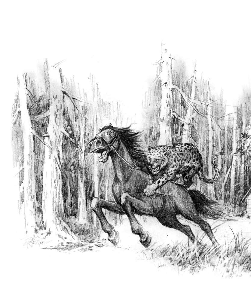 “爷爷骑的马跑得很快,因为它也吓坏了。但它怎么也甩不掉那头豹子。在漆黑的树林里,豹子一直穷追不舍。那是一头凶狠的豹子,跑起来跟马一样快。它一会儿在道路这边叫,一会儿在道路那边叫,一直紧紧地跟在后面。