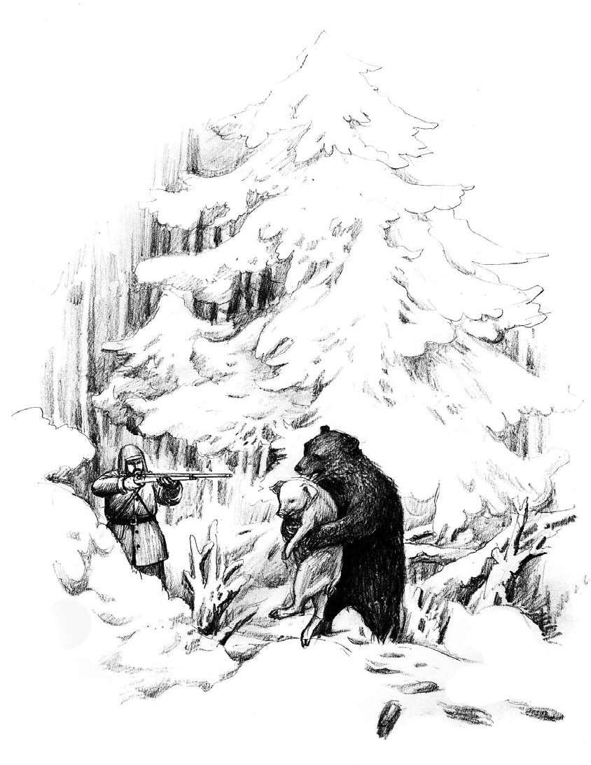 爸回来的时候,马车里除了一头熊,还装着一头猪。当时,他手里拿着大号的捕熊夹,肩上扛着猎枪,正走在林子里搜寻猎物。当他绕过一棵积雪覆盖的大松树时,看到了正在松树后面的这头熊。