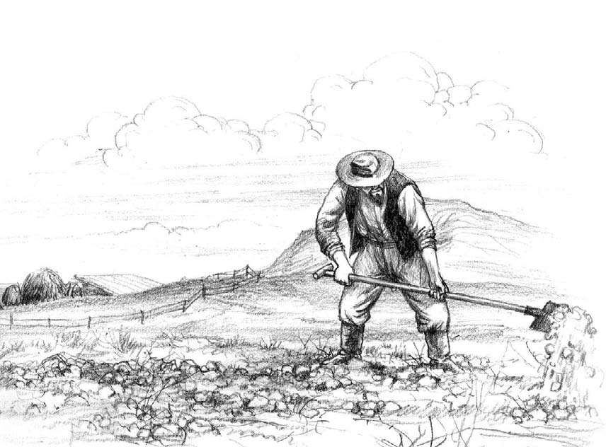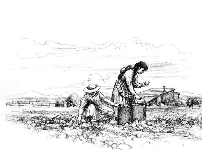 一块块厚厚的泥土被翻出了地面,泥块之间还连着草根。爸在草泥块里挖小土豆,劳拉和卡瑞将土豆放入铁皮桶中。干巴巴的泥土沾在手指上,一股寒意直蹿至脊梁骨,这让劳拉讨厌极了,可是有什么办法呢?总要有人捡土豆。她和卡瑞提着桶,在地里来回吃力地走着,终于装了满满五口袋土豆,所有的土豆都在这里了。