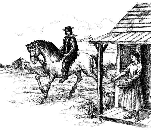 果不其然,第二天一早,劳拉就看到大个子杰利骑着白马从木屋前经过。他朝在商店干活儿的爸打了声招呼,爸也冲他挥了挥手,然后,杰利疾驰向工地。