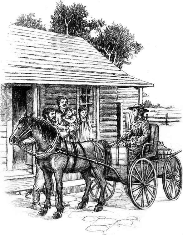 一天清早,劳拉正在洗碗,忽然听到在台阶上晒太阳的老杰克发出呜呜的低吼。她朝屋外望去,看见普拉姆溪的碎石滩上,一辆马车正朝这里驶来。