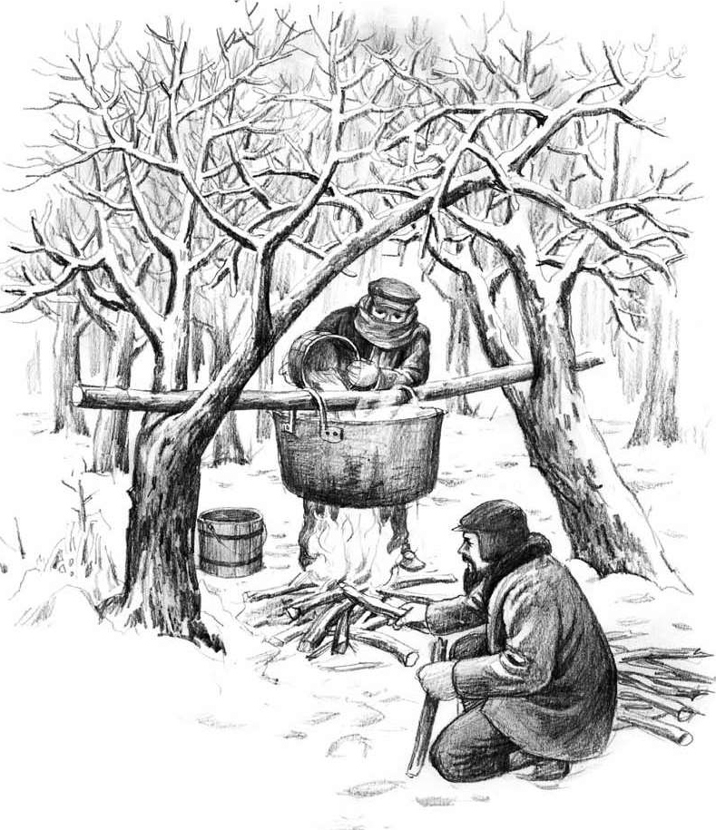 终于,南坡和西坡上的积雪有了松动。中午时分,冰凌开始滴起了水珠。树干里的汁液也开始向上流动,正是做糖的好时候。