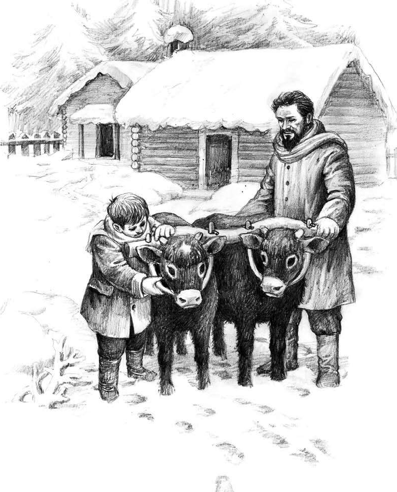 爸爸教他如何将牛轭小心地套到小牛柔软的脖颈上。他必须用一块碎玻璃打磨牛轭弯曲的内侧,直到它的弧度刚好适合小牛的脖颈,表面如丝一般光滑才行。随后,阿曼佐打开牛栏,两头好奇的小牛跟着他来到了冰冷、刺眼的雪地里。