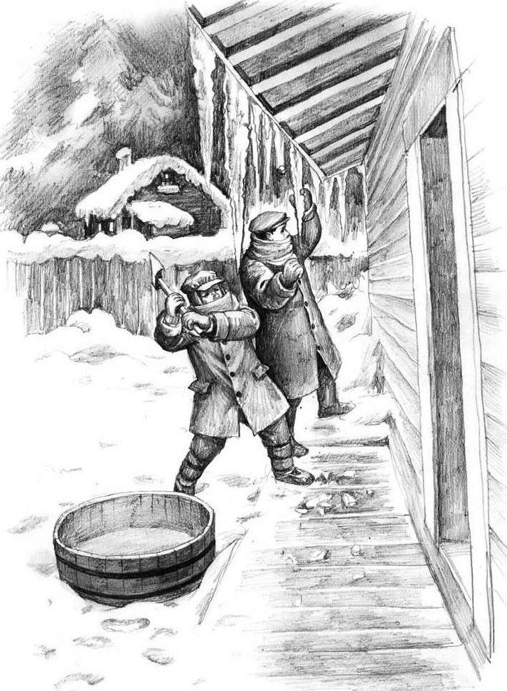 厨房的屋檐上挂着长长的冰凌,尖尖的一头几乎垂到了雪地上。阿曼佐抱住一根冰凌,猛地摇了摇,只掰下来一小截。