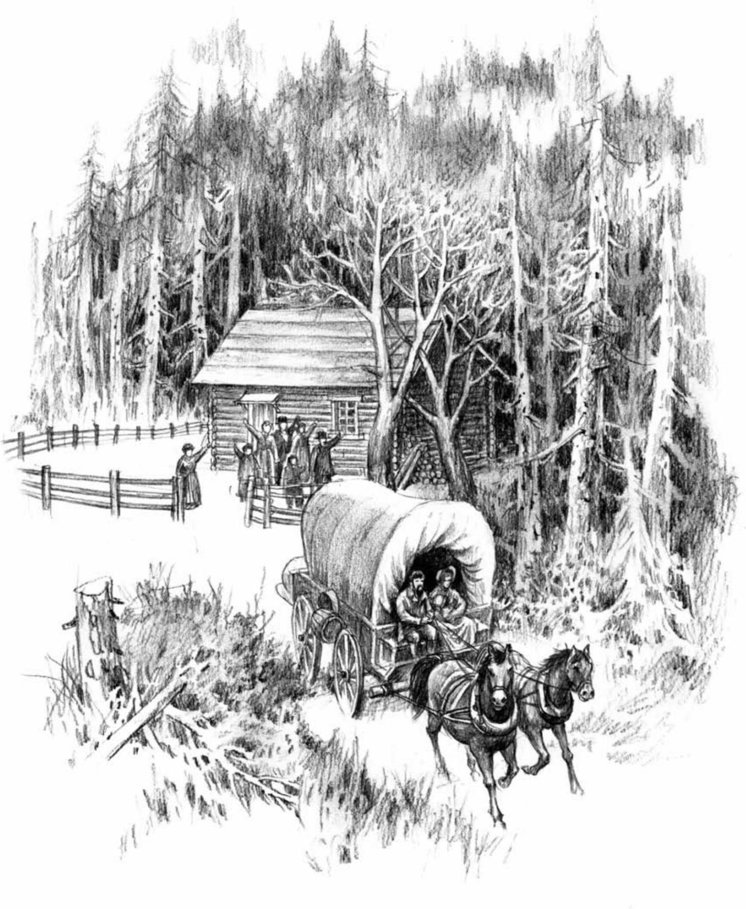 叔叔们帮着爸把马套在车上。大人们叫那些堂兄妹们亲吻玛丽和劳拉,他们这么做了。爸先抱起玛丽,又抱起劳拉,把她们放在马车后面的床上。爸扶着妈上了马车,奶奶上前把小宝宝卡瑞递给了妈。爸爬上来坐在妈的身边,斑点牛头狗杰克钻到了马车底下。