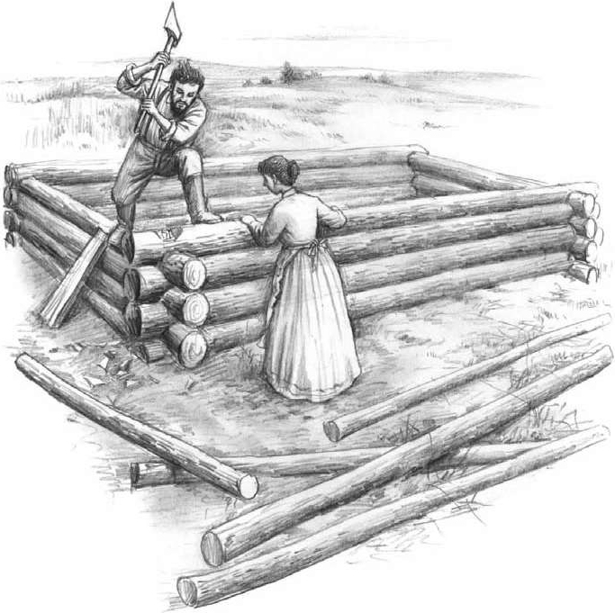 第二天爸开始砌墙。他从每一边把一根木头滚上去,在顶端凿出凹槽,然后他把木头翻过来,跟下面木头的顶端互相咬合,让它们的凹槽正好卡在下面的木头上。现在,整座房子有两根木头高了。