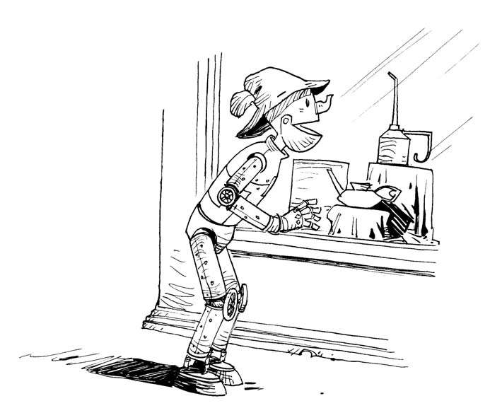 像所有爱美的孩子一样,小钉子也无法抗拒打扮得漂漂亮亮的诱惑。他伸出一只手,只点了一下,玻璃就全碎了。他平心静气地进入橱窗,轻松自如地拿了几瓶“锃亮”牌擦光油。要把自己的身体擦得光亮光亮的,确实是一件烦琐、累人的活儿,但小钉子却乐此不疲。