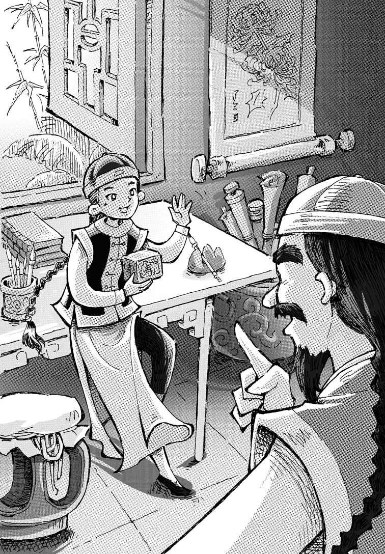 只见一位少年大大咧咧地在他书房里翻看着书桌上的东西,十六七岁年纪,长得白白净净的,圆脸蛋、薄嘴唇、小翘鼻子、细眉细眼、宽大额头,纺绸长衫上套一件缀边缎子马褂,腰间还坠着一个绣花荷包,那模样潇洒倜傥,活脱脱一个率性豪爽的富贵人家公子。