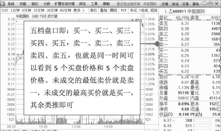 通常情况下,在股票行情软件上分别显示买卖各五个价格,即五档盘口。如图1-13所示,为华能国际(600011)2018年3月1日的分时图,图中所示的盘口数据,最上方的便是五档盘口,分别列出了市场上正在挂出(即挂单卖出的简称)的买入价和卖出价。