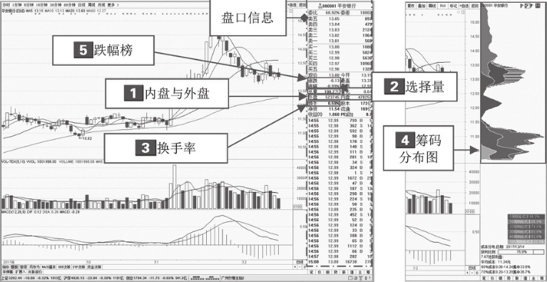 在看盘软件中,主窗口透露出了很多的重点盘面信息。它直接反映了内盘与外盘、成交量、换手率(即在一定时间内市场中股票转手交易的频率)、筹码分布图(位于K线图窗口右侧,由紧密排列的水平柱状条构成)以及跌幅榜等信息,如图1-12所示,具体有非常重要的分析价值。