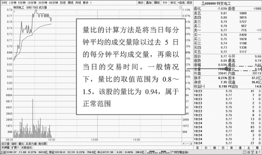 量比是指当天成交总手数与近期成交手数平均数的比值,量比指标主要用于观察最近5个交易日的成交量的活跃度。如图1-16所示,特变电工(600089)2017年7月19日的量比为0.94。