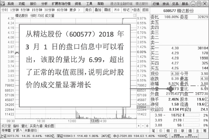 量比数值的大小表示近期此时成交量的增减,大于1表示此时刻成交总手数已经放大,如图1-17所示;小于1表示此时刻成交总手数萎缩。