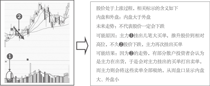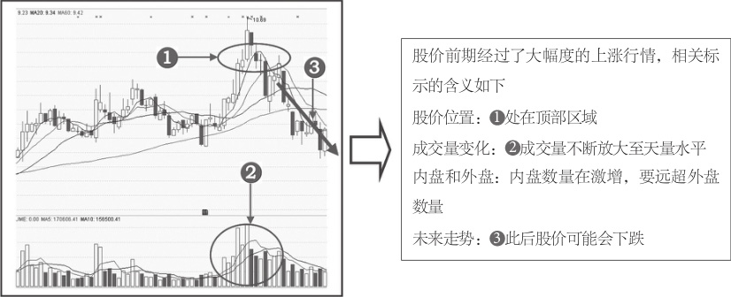 图1-21 股价处于上涨后的顶部区域的外盘和内盘分析