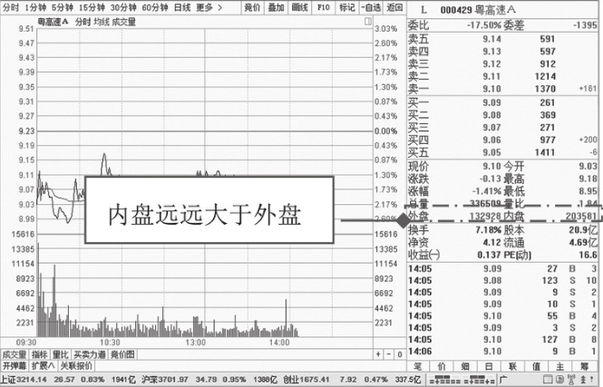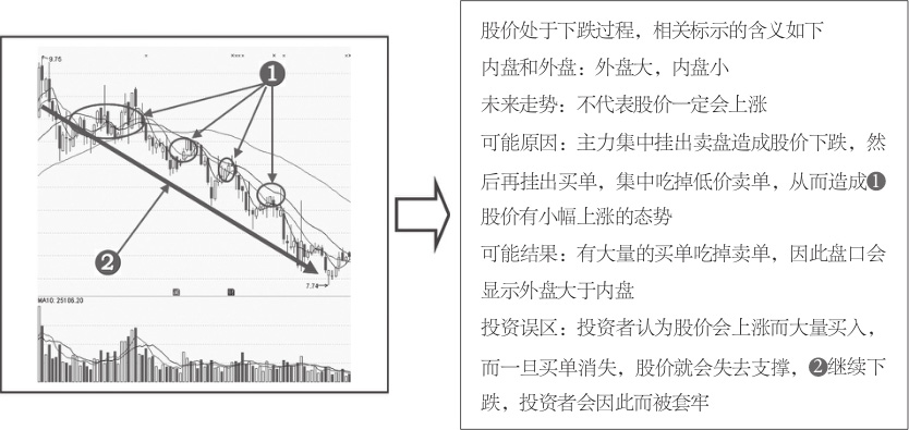 图1-22 股价处于下跌过程中的外盘和内盘分析