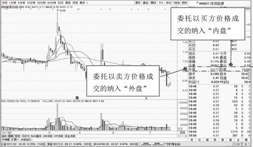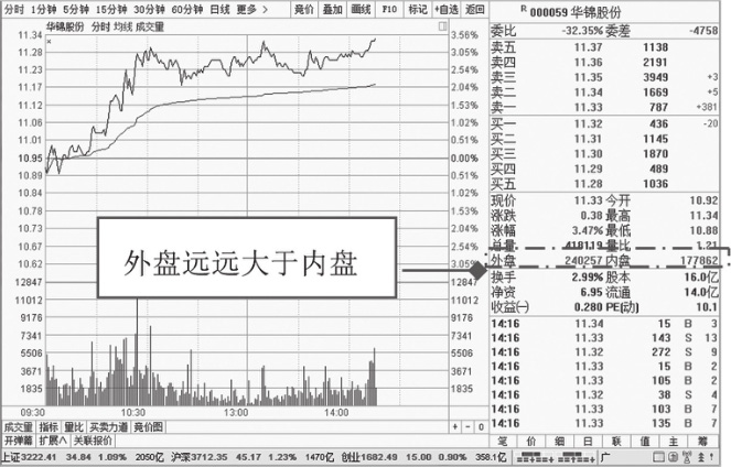 图1-23 股价处于上涨后的顶部区域的外盘和内盘分析