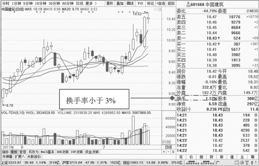 如图1-30所示,为中国建筑(601668)2017年7月19日的走势图。该股当日的换手率为1.12%,在3%之下,属于正常情况下的换手率。一般情况下,除了新上市的股票以外,非热门个股的换手率一般在3%以下。
