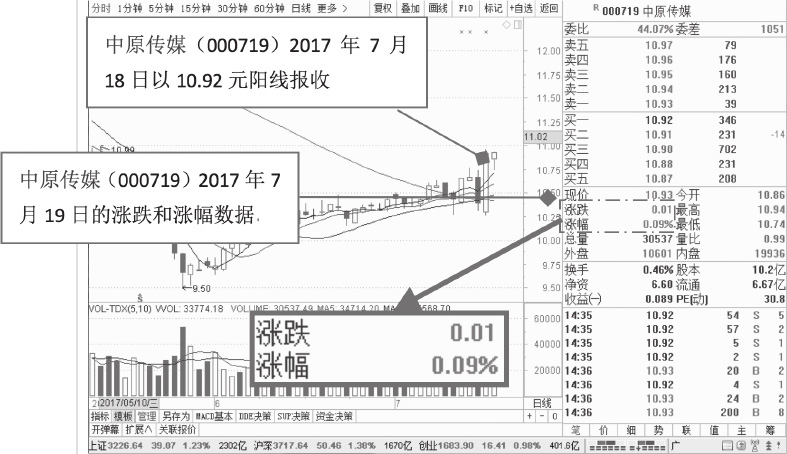 图1-28 中原传媒(000719)2017年7月19日股价涨跌为0.01