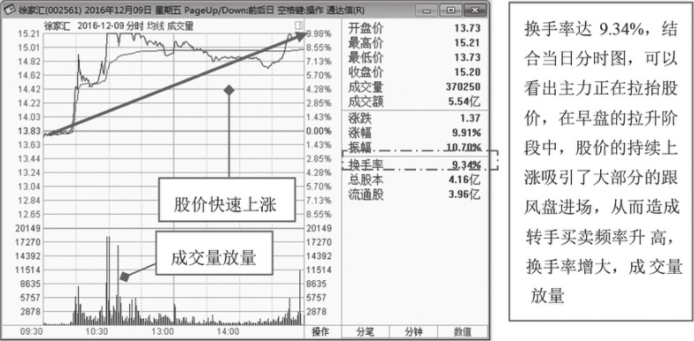 如图1-32所示,为徐家汇(002561)2016年12月9日的分时走势图。该股当天股价稳步上涨,换手率高达9.34%,并且成交量持续放量。