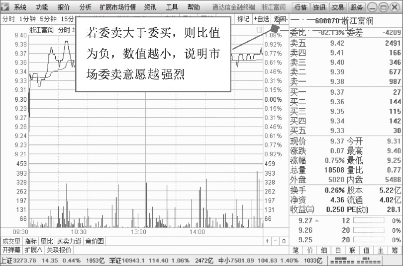 如图1-14所示,为浙江富润(600070)2018年3月1日的分时图,该股委比为-82.13%,说明卖方的力量大于买方。
