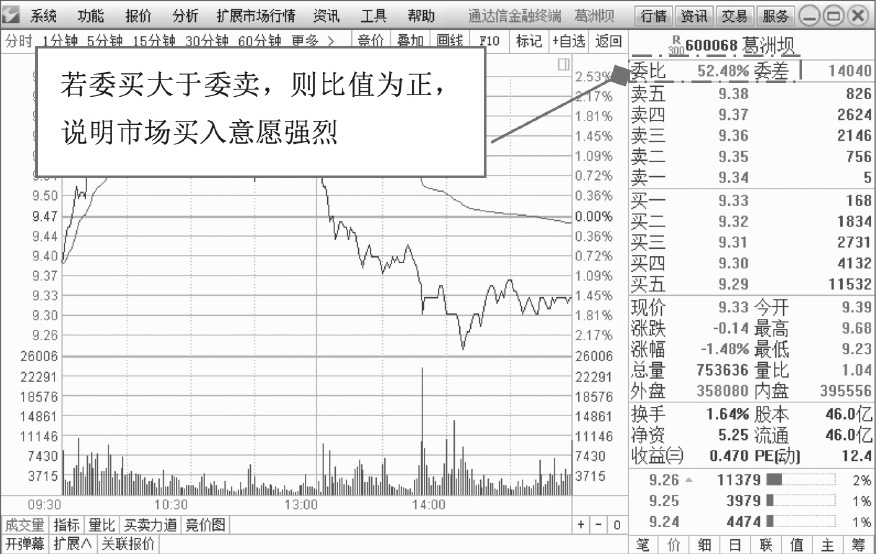 如图1-15所示,为葛洲坝(600068)2018年3月1日的分时图,该股委比为52.48%,说明买方的力量大于卖方。