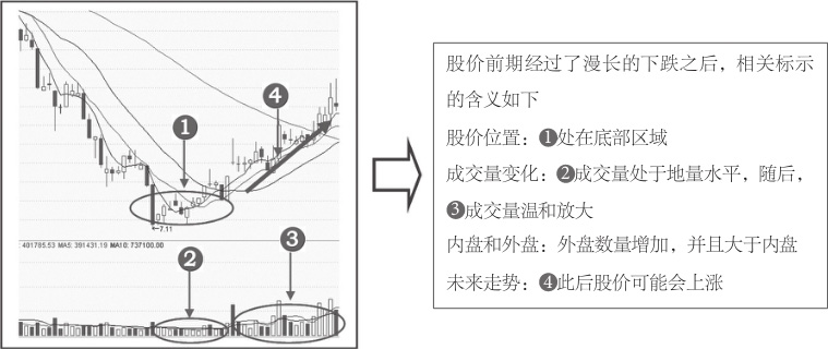 图1-20 股价处于下跌后的底部区域的外盘和内盘分析股价