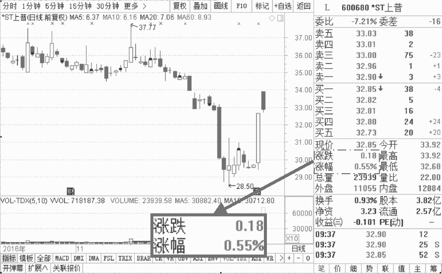 在五档盘口窗口下方的区域中,投资者可以直接获取当前股票的涨跌情况和涨跌幅度,其中,涨跌数据和涨幅数据为红色,则表示当前股价相对于上个交易日的收盘价上涨,如图1-26所示,*ST普天(600680)于2016年12月23日的股价相对于22日的股价上涨0.18元,涨幅为0.55%。