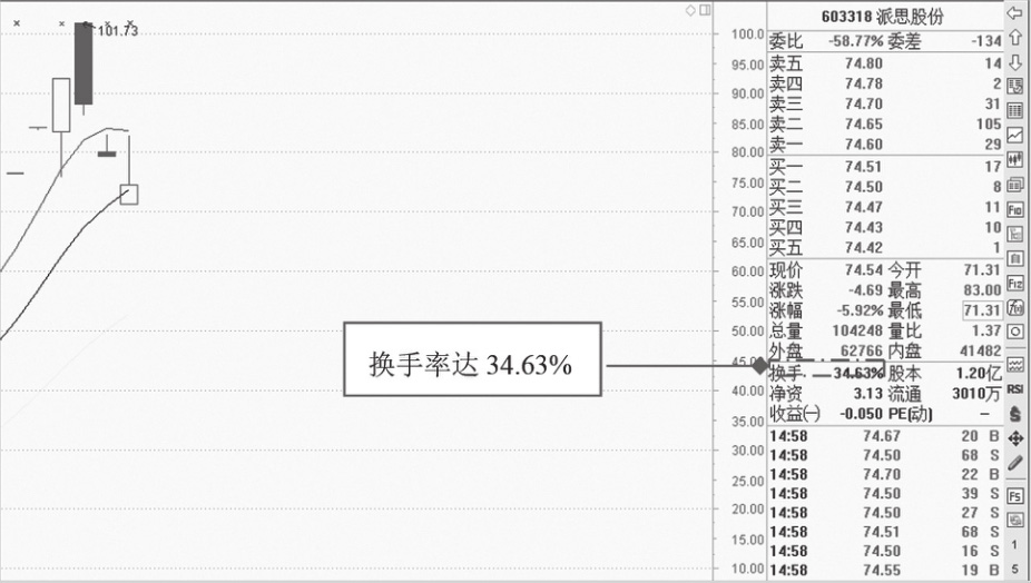 如图1-31所示,为派思股份(603318)2015年6月3日的走势图。该新股从发行价9.39元一路连续以一字线涨停,不久股价低开,当日换手率高达34.63%,说明有大量筹码再次转手买卖。