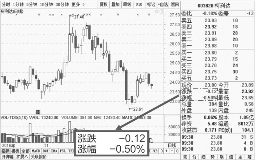 如果涨跌数据和涨幅数据为绿色,则表示当前股价相对于上个交易日的收盘价下跌,如图1-27所示,柯利达(603828)2016年12月23日的股价相对于22日的股价下跌0.12元,跌幅为-0.50%。