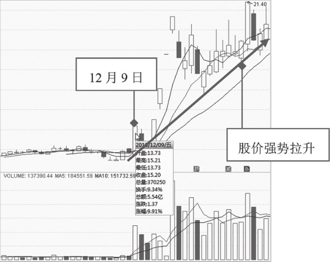 如图1-33所示为徐家汇(002561)的K线走势图,该股股价在12月9日走出一根大阳线,当日换手率增大,成交量持续放量。此后,股价更加强势的上涨,一直涨至21.40元的高点。