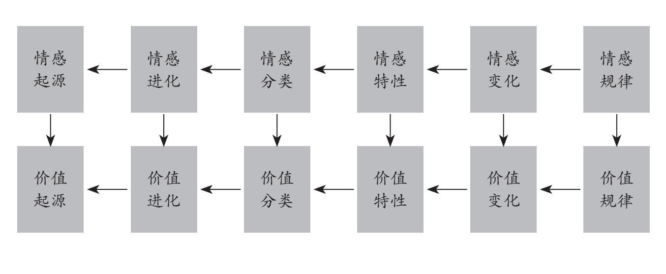 价值的起源经历了无序化无机能量、无序化有机能量、无序化高分子能量、准有序化多分子体系能量(即准价值)、生物化学能(即原始价值)等五个阶段。情感的起源则经历了从无机化学反应、有机化学反应、有机高分子聚合反应、有机多分子体系链式反应、原核生命的趋性反应(即原核趋性)等阶段。