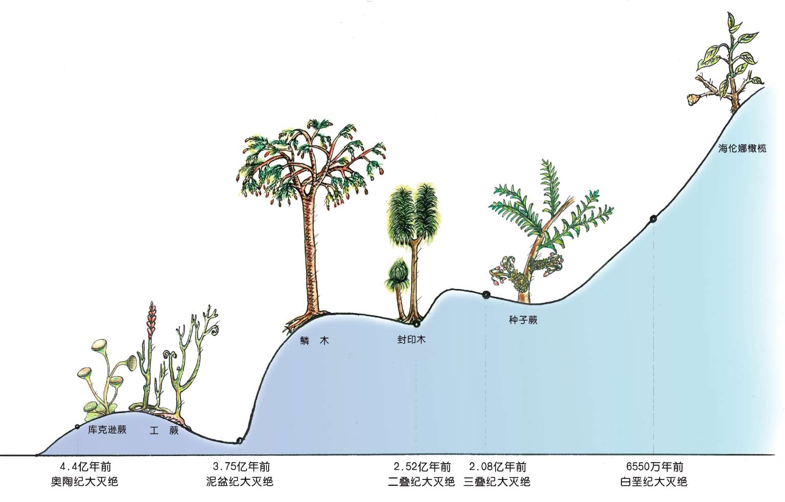 自地球出现生物以来,经历了30多亿年漫长的进化过程,地球上曾先后产生和存活过上亿种生物,但是伴随着地质运动、火山喷发等环境骤变,地球上曾发生过五次具有全球影响的生物大灭绝事件,分别为4.4亿年前的奥陶纪—志留纪、3.75亿年前的晚泥盆纪、2.52亿年前的二叠纪、2.08亿年前的三叠纪以及6 550万年前的白垩纪末期的生物大灭绝。每一次大灭绝事件都伴随着植物大规模的减少和物种绝灭,绝大多数的物种在人类诞生前就已经走完了历程。