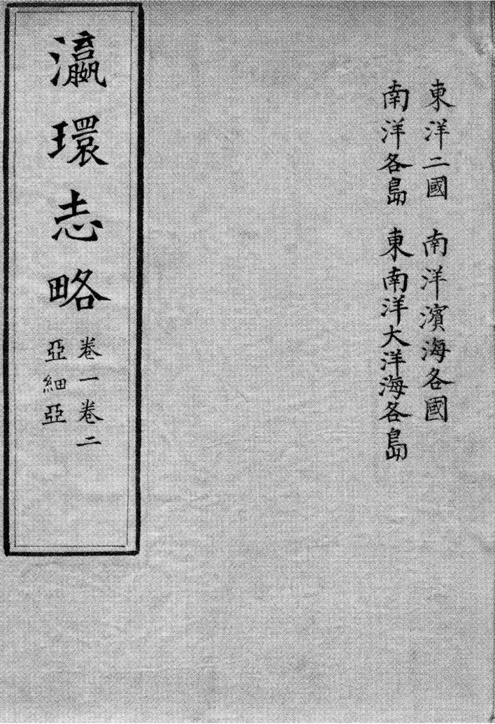 《海国图志》六十卷,何所据?一据前两广总督林尚书所译西夷之《四洲志》,再据历代史志及明以来岛志,及近日夷图、夷语,钩稽贯串,创榛辟莽,前驱先路。大都东南洋、西南洋增于原书者十之八,大、小西洋、北洋、外大西洋增于原书者十之六。又图以经之,表以纬之,博参群议以发挥之。