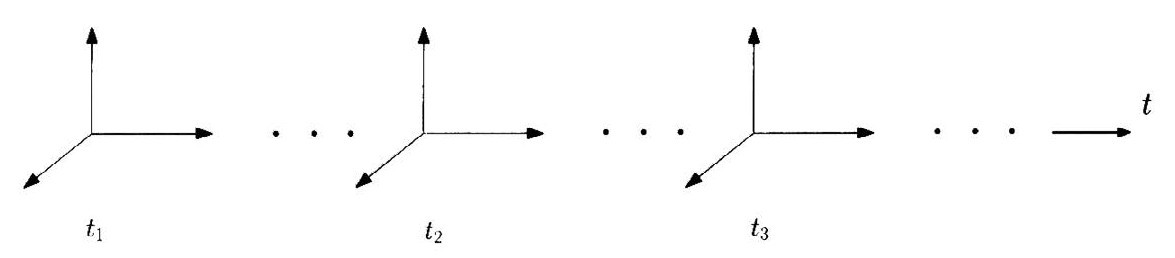 图1.4 由于我们无法描绘四维空间的图形,这里只是对四维“时空”的一个粗浅解说。时空的基本想法就是:我们世界的三个空间维度(以x,y,z轴表示)基本上和第四个维度(时间)是一样的。我们将时间想成是一个不断变动的连续变数,上图是在时间t 1 ,t 2 ,t 3 ……时的空间坐标轴冻结画面。利用这个方式,我们希望能呈现整体四维的感觉,即三个空间维度再加上时间