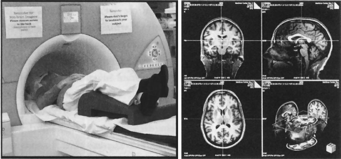 我们现在已经知道大脑在很多不同的层面上发挥着作用。除了脑波,我们还可以通过监测血流和化学反应的变化来了解大脑,还可以通过观察不同组织和脑细胞在不同时刻应对重复性经验的反应来探索大脑。如今在神经学研究中最常用的一些工具有磁共振成像(MRI)和功能性磁共振成像(fMRI)。在进行磁共振成像时,病人躺在床上,床滑进一个大大的圆筒里(见图2-2)。扫描仪强大的磁场让大脑中质子的排列方式与磁场下金属屑的排列方式保持相同。然后短暂的无线电射频脉冲使质子脱离这种一致的排列,在质子恢复原位时,它们会发出一个信号。它们恢复原位的速度取决于所属的组织类型。扫描仪提取这些差异,将对比鲜明的信号转化成大脑的解剖图。