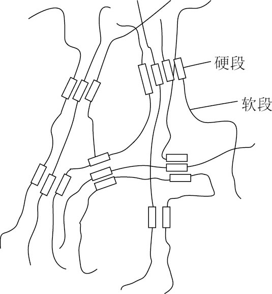 聚氨酯是一类重要的功能性高分子阻尼材料,材料内存在着所谓的软段相区和硬段相区,是一种多相体系,如图2.13所示。组成聚氨酯的组分是具有极性的官能基(如有机二异氰酸酯或多异氰酸酯与二羟基或多羟基化合物),使高分子长链之间不但可形成极有效的物理氢键现象,且彼此有较高的相容性、高弹性和耐磨性。同时,聚氨酯的氢键还表现出一定的微相分离特性,即在微观尺度形成两相结构,这有助于获得较高的损耗因子。