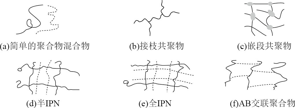 黏弹性阻尼材料种类很多,但真正在工程上有应用价值的不多。一般工程应用,要求损耗因子大于0.3的温度范围为60~80℃,但是普通橡胶类材料的转变态区Δ T 0.7 大部分位于室温以下,而塑料类的则往往过高。只有少数聚合物能工作在该范围内,但转变态区温度范围往往很窄,性能不稳定。因此,工程上使用的黏弹性阻尼材料,通常是在聚合物中加入某些添加剂,通过共混改性、嵌段和接枝共聚、互穿聚合物网络IPN等方法,如图2.8所示,使其转变态区满足使用温度范围的要求,并且有足够大的损耗因子。