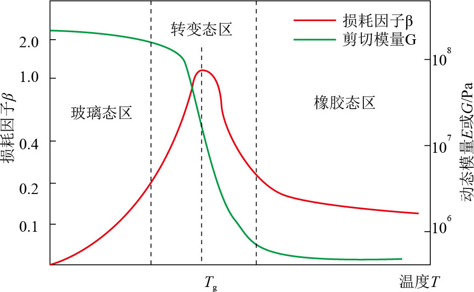 当温度上升到某一特征值附近时,材料的模量急剧下降,可下降100~1000倍,同时损耗因子迅速上升,经历最大值(一般在0.5~2.0之间)后又回降到较低的数值,这个性能发生急剧变化的区域称为转变态区(也称为玻璃化转移区),其损耗因子 β 的最大值所对应的温度称为玻璃化转变温度 T g ,而 β > 0.7的温度范围则为阻尼材料的适用温度区域,即转变态区的边界,记为Δ T 0.7 。