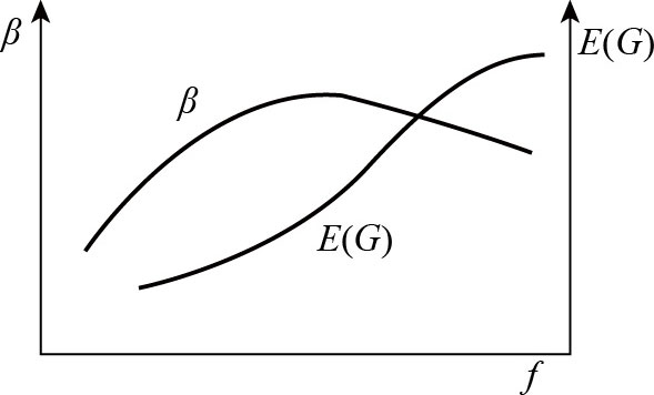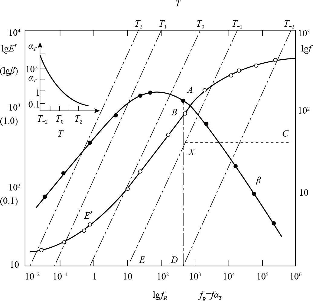 这样,根据温频等效原理,就可以把阻尼材料模量 E 或 G 和损耗因子 β 相对于频率 f 及温度 T 的关系转化为仅仅与 f R 的关系。这非常方便在工程上应用,人们可以仅用一条曲线来表示阻尼性能与温度和频率的关系,如图2.7所示,该图称为材料阻尼特性的诺模图。现在市场上有许多专门绘制阻尼材料诺模图的软件,可以方便地将测试数据拟合成 E ' - f R 或 β - f R 曲线。