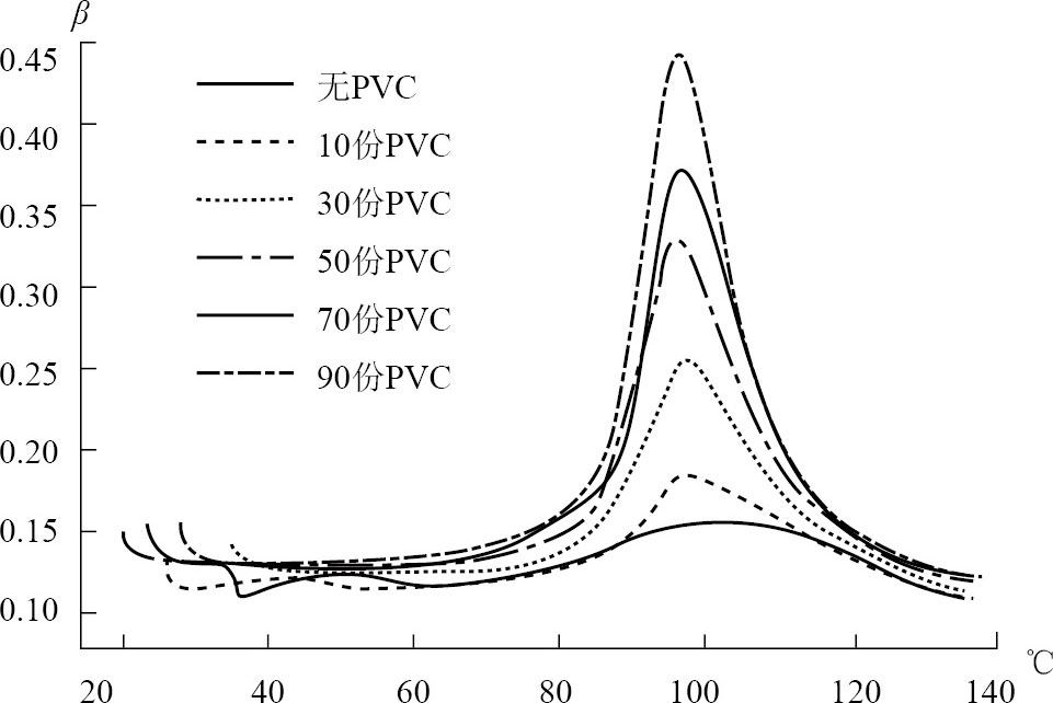 以氯化丁基橡胶为例,其玻璃化转变温度较低( T g =-56℃),有效的阻尼温度范围在 T g ±(10~15℃)之间,现采用阻尼性能较好的PVC糊树脂( T g =90℃)来通过共混改性氯化丁基橡胶,提高其阻尼性能。图2.9是PVC/CIIR共混材料损耗因子与测试温度关系曲线,在80~120℃温度区域,材料的损耗因子随着PVC含量的增加不断升高,当PVC含量达到90份时,阻尼性能达到最好,损耗因子为0.44。伴随着峰值的上升,阻尼曲线峰宽略有增大。
