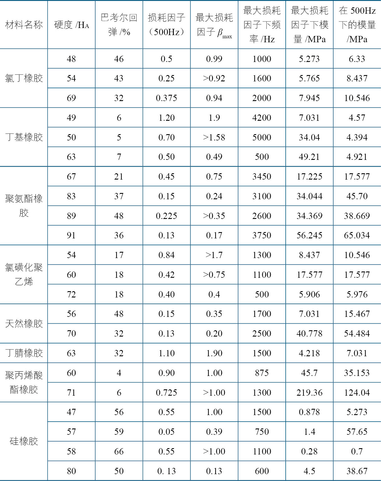橡胶自身具有良好的弹性,而且可天然获取,因此,传统上是阻尼减振应用的首选材料。橡胶阻尼材料种类繁多,不同组分构成,其阻尼性能不同。一般地,用于制备橡胶阻尼材料的聚合物基体中,丁基橡胶和丁腈橡胶的阻尼系数较大,是制作阻尼减振材料的常用原料。丁苯橡胶、氯丁橡胶、硅橡胶、聚氨酯橡胶等的阻尼系数中等,而天然橡胶和顺丁橡胶的阻尼系数最小。图2.12为9050型橡胶阻尼材料的诺谟图,该材料是目前应用较为广泛的一种阻尼材料,其最大损耗因子为1.5,200Hz对应的剪切模量为6.5MPa,最佳使用温度为10℃,最佳使用频率为100~5000Hz。表2.3是若干橡胶的阻尼特性。