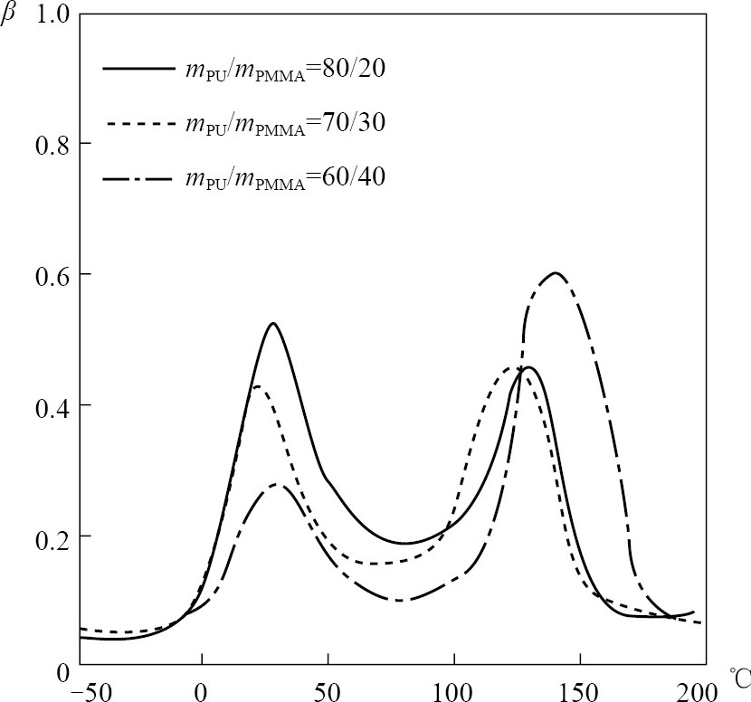 图2.11所示是不同组成的聚氨酯(PU)与聚甲基丙烯酸甲酯(PMMA)半互穿网络体系的阻尼性能。纯PU通常只有一个阻尼峰,与PMMA互穿网络聚合后,形成了两个阻尼峰,温度适用范围明显加宽。当PMMA相由20 (质量份数)增加至30时,其转变态区变化不大,但是当PMMA相增加至40时,PMMA相的转变态区明显向高温区移动,峰强度增大。